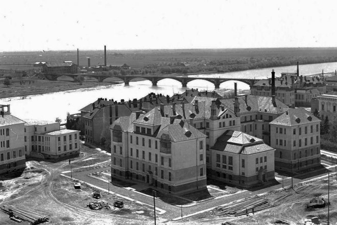 Klinikakert, előtérben a sebészeti klinika tömbje, háttérben a vasúti híd és Újszegeden a kendergyár (1929) (Fortepan / Kozma János)