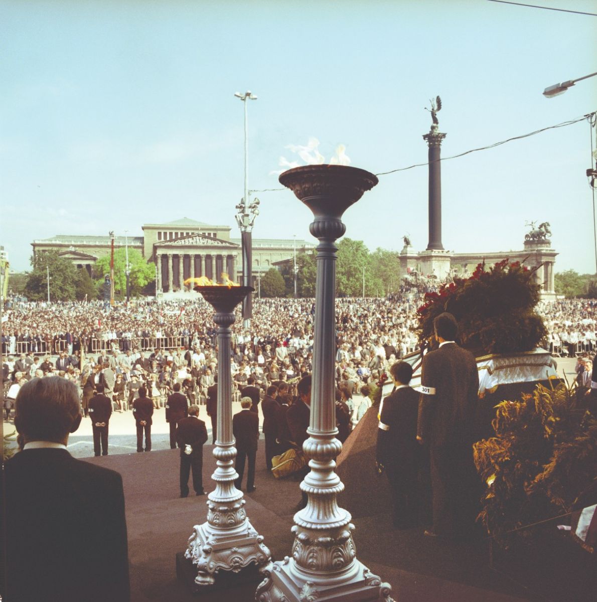 Az 1989. június 16-án széles körű társadalmi részvétellel lezajlott újratemetés a közgondolkodásunkban szimbolikus eseménye a rendszerváltás történetének. Szinte lehetetlen igazságot tenni abban a kérdésben, hogy az akkor lezárulni vagy éppen megnyílni látszó új korszakhoz tartozik-e inkább, mivel történelmi határvonalon, de legalábbis egy nagyon-nagyon szűk határmezsgyén helyezkedik el. Ezen a napon az 1956-os forradalom és szabadságharc küzdelmeinek áldozatai is elnyerték végtisztességüket. A hivatalosan „nem hivatalos” eseményen a fővárosban 250-300 ezren vettek részt, vidéken számos helyen tartottak megemlékezéseket, a televízió közvetítését pedig milliók kísérték figyelemmel.